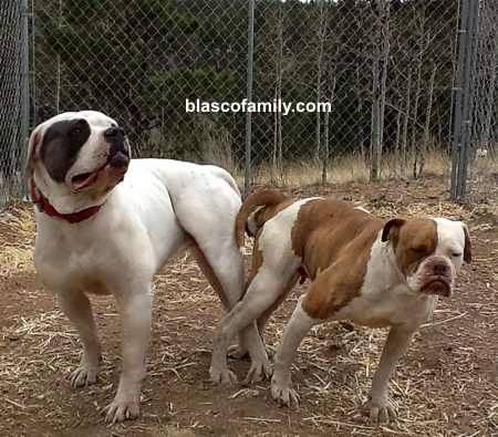 Here Cherry is tied on with Doc. Dogs start out with the male on top, and then upon successful entry, climb off and turn themselves all the way around backwards. This shot is also good for a size comparison. Doc is 115 pounds and just over 27 1/2" at the withers (shoulders). Cherry is under 80 pounds, only 21" at the withers. Cherry is a little girl. That's common among American Bulldogs, the female being much smaller than the male. Doc and Lilly's mom, Bella, is small also, but produces dogs of at least 100 pounds exclusively. Cherry and Doc produced Nacho from this breeding. Nacho is a 100 pound dog. |
