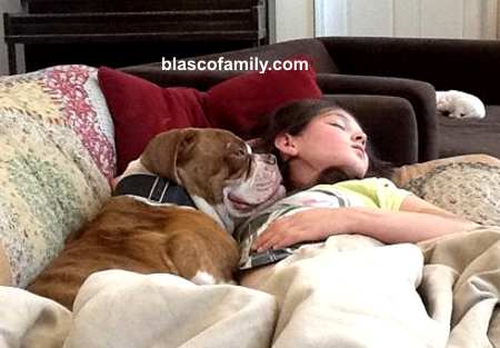 In this shot, Cherry has been laying there wide awake for over an hour as Kat sleeps, unwilling to move for fear of waking her. Judah used to do this exact same thing, as do a number of the others. American Bulldogs really are just very child oriented. Cherry is a sweet heart. |