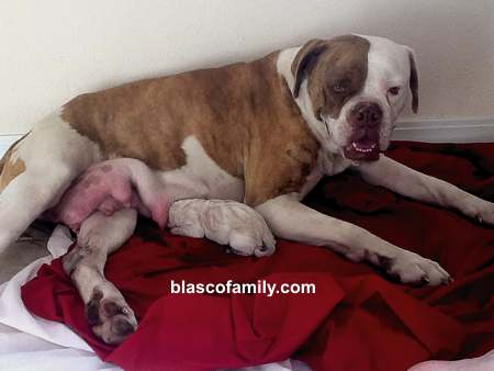 Cherry is great mom. Here she is with Nacho, small litters being common for very tightly bred dogs, such as Cherry. We had another female outright reject her puppies only hours after birth. Cherry adopted them too. For a while, Cherry's adopted litter, plus Nacho, and a different litter of Bellas, all nursed freely between both mothers. It made for some very fat little dogs - and a busy, hectic house with 18 puppies running back and forth between two nursing mothers! Take a look at Nacho's page to see how she and Doc produced. |